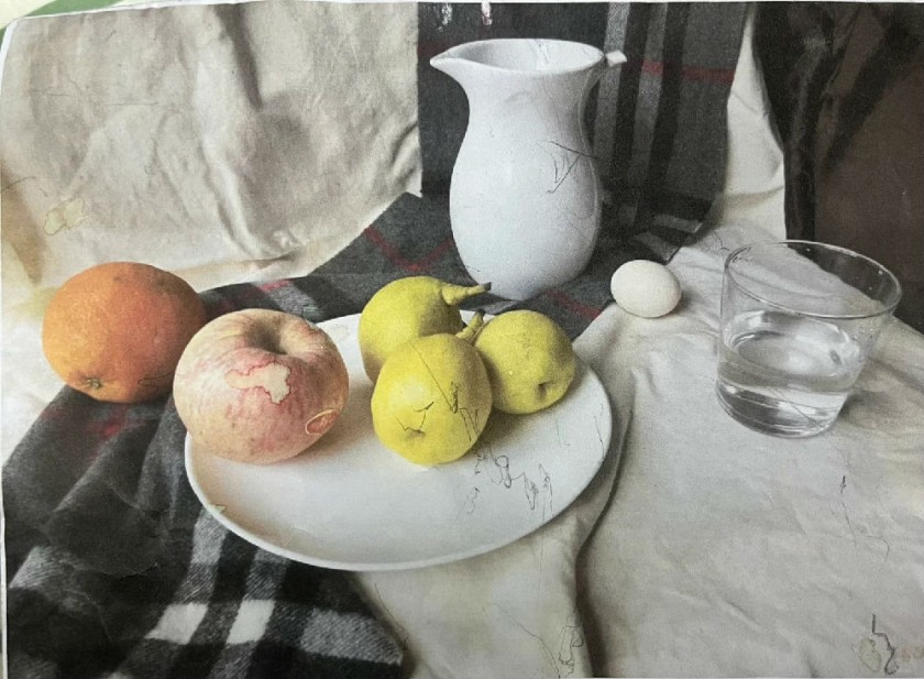 2021年:浅色花瓶+白盘子(上面放着小刀)+一些水果(梨和苹果比较多),背景是两块浅色的布