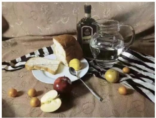 2023上海美术联考色彩考题:照片模拟写生,红酒瓶、陶罐、绿苹果、黄柠檬、高脚杯(盛有果汁)、白瓷盘、不锈钢刀,红色、白色、灰色衬布各一块。