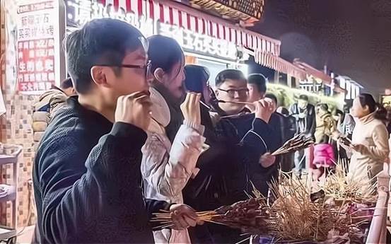 2022上海美术联考速写考题:四个人吃羊肉串。胖子正脸有一个,两个侧脸,还有一个背影,一个放牙签的箱子旁边有一个垃圾桶后面背景有门店,如下图