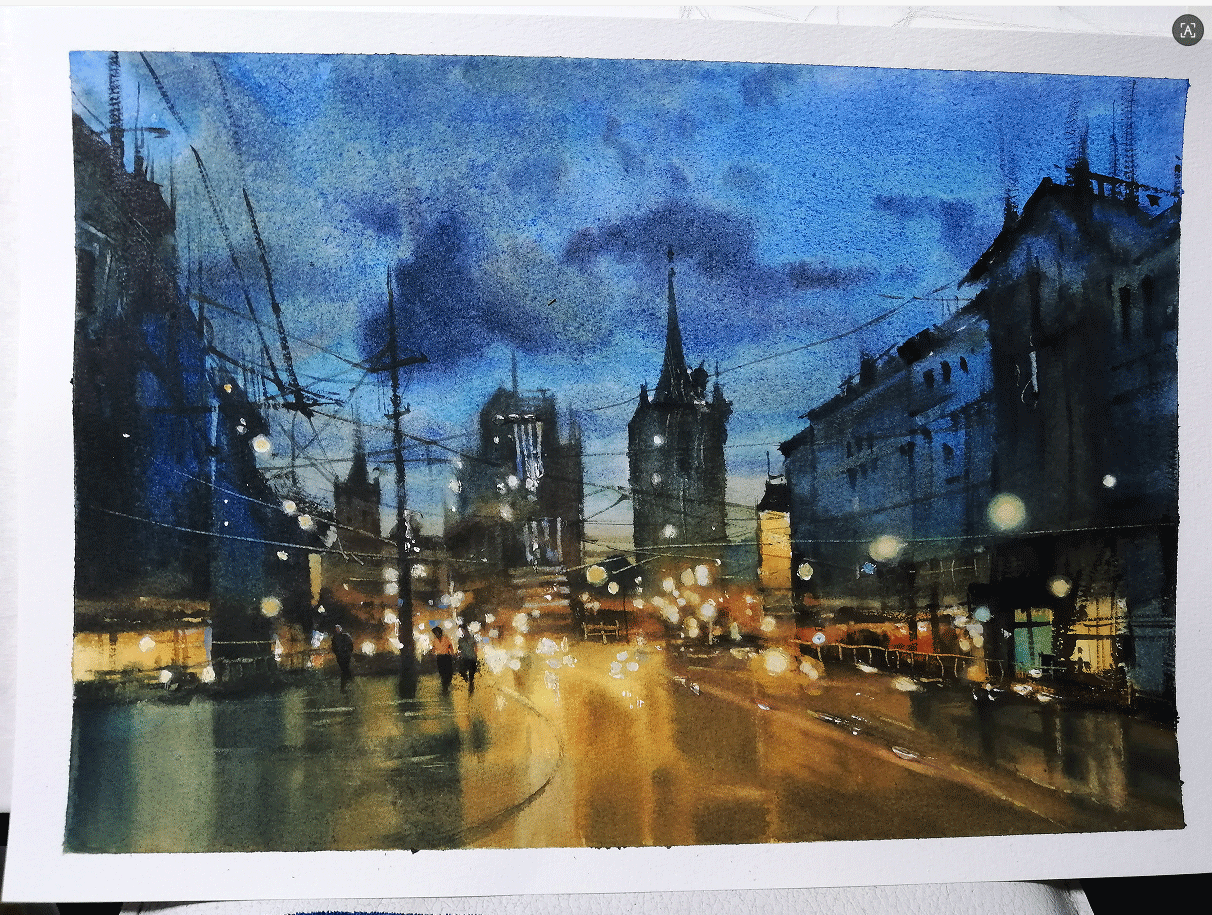 水彩风景建筑夜景